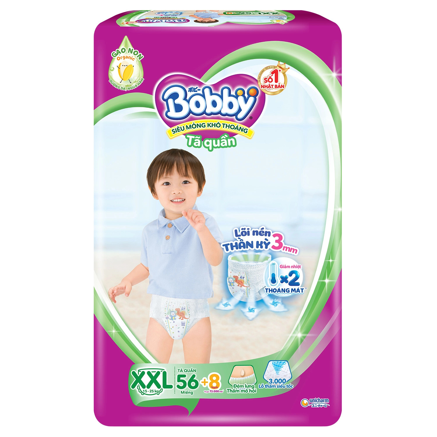 Tã quần Bobby size XXL 56 miếng đến từ thương hiệu Bobby – là thành viên Tập đoàn Unicharm (nhà sản xuất tã lót em bé số 1 Nhật Bản), đồng thời là nhãn hiệu tã giấy số 1 Việt Nam – tự hào được lựa chọn và đồng hành cùng hàng triệu em bé từ những ngày đầu tiên chào đời. Nay, ứng dụng công nghệ tiên tiến từ Unicharm, Bobby cam kết sẽ nỗ lực không ngừng để đem đến sự thoải mái tối đa cho bé yêu – như vòng tay âu yếm của bố mẹ. Bobby tiên phong mang tới Cuộc cách mạng ngành tã trẻ em – Mỏng không tưởng, thấm hút bất ngờ với tã quần Bobby Lõi Nén Thần Kỳ 3mm. Với công nghệ ép lõi đặc biệt sáng tạo nên LÕI NÉN THẦN KỲ 3MM, tã sẽ siêu mềm, mỏng mà thấm hút vượt trội, tuyệt đối không vón cục, đồng thời thoáng khí gấp 2 lần mà vẫn thấm hút lượng lớn nước tiểu.