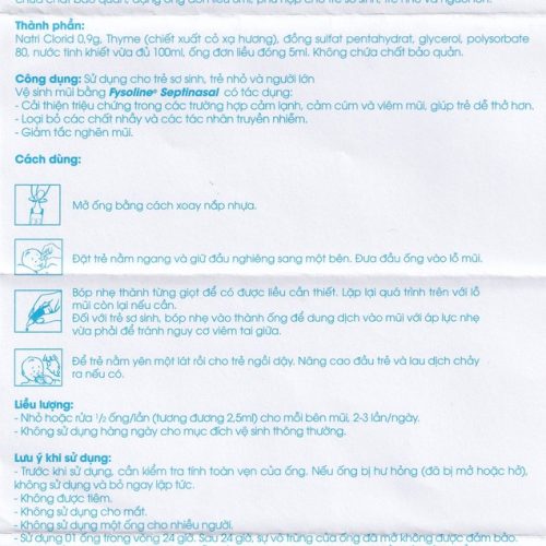 Fysoline Septinasal Gifrer là loại nước muối sinh lý kháng viêm. Đây là sản phẩm không phải kháng sinh nhưng có tác dụng hỗ trợ điều trị các bệnh viêm, nhiễm khuẩn như viêm mũi, sổ mũi, nghẹt mũi an toàn cho trẻ sơ sinh và trẻ nhỏ.