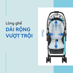 – Lòng ghế dài 75cm, rộng 34cm – (dài hơn 9cm so với dòng xe chống đẩy chống gù trước đây) giúp bé nằm/ ngồi cực kỳ thoải mái.