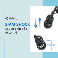 – Đồng thời, trục bánh xe kép (cả bánh trước và bánh sau) và kích thước bánh xe lớn 140mm giúp xe đi trơn tru, lướt êm trên nhiều kiểu địa hình đường xá. Bé sẽ không bị giật mình, tỉnh giấc khi đang ngủ trên xe đẩy.